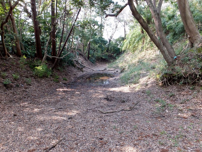 報徳二宮神社のある曲輪は戦国時代の後北条氏の頃に作られたそうで、江戸時代前期には雷曲輪、後期には小峰曲輪と呼ばれていたのですが、その曲輪を囲むのがこの空堀。その後の時間経過によって浅くはなっていますが、往時は7~8mの深さがあり、また堀の底は障子堀の畝が設けられていたと考えられているそうです。
