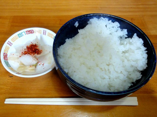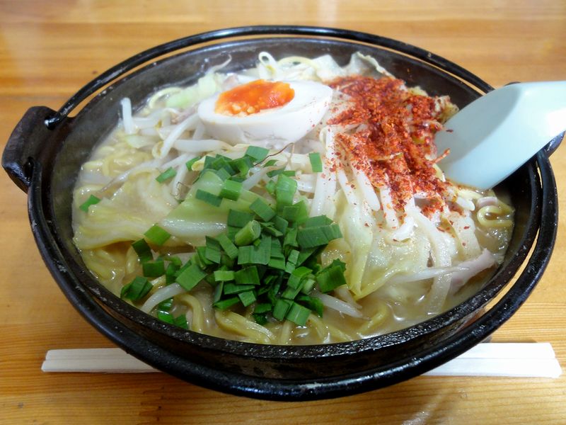 いただいたのは、店主さんに「お勧め」と言われたこちら。熱々になている平たい鉄鍋で登場したラーメンからは、ニンニクと、モツなどの具材、そして中華麺を煮込んだような香りが立ち昇っています。それでまずはスープからいただくと、動物系を筆頭とした旨味が感じられるのですが、今時のドロドロ系とはまた違った濃厚さというか。そして味付けが不思議で、塩でも醤油でも味噌でもないというか、塩気は十分に感じられるものの、塩味だけではない醸造したような味もしっかりと感じられ、また自然な甘みも有りますね。それと、表面の唐辛子は、辛さ抑えめの韓国産唐辛子だと思うのですが、全体に混ぜてみてもあまり辛くならず、唐辛子自体の香りもマイルドです。また麺は、中くらいの太さのストレートタイプ。鉄鍋で煮込むのが前提のせいか、かなり固めのゆで加減。ですが、これはこれで悪くないです。そして具は、キャベツ、タマネギ、モヤシなどの野菜類に、細く切られたモツ(お品書きにはてっちゃんとありました。)。ちなみにモツが苦手な方は豚肉に替えてくれるそう。あとちょうど良い具合に半熟の味玉は、薄めの味付けでした。それと、一緒にいただいたライスセットですが、お品書きではライス+キムチと書いてあるところ、白菜漬けに韓国唐辛子が載った物でした。(まぁ、あまり問題はないですが。)で、最後の〆に、残ったライスをスープに投入したところ、スープの旨味が濃いので、ライスと良く合いますね。