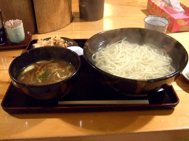 それほど混んでいなかったせいか、それほど待たずに登場した釜あげラーメンは、麺の入った丼から、湯気がもうもうと立ち上っています。好感接客の髭の店員氏に、付け汁が薄まったらタレ(写真では隠れてしまっています)で調節、付け合わせの揚げ物(本日はネギと桜エビのかき揚げでした)は揚げたてなのでお熱いうちに、また、かき揚げを付け汁に入れても付け汁に絡んで美味しい旨の説明を受け、いざ。それでまず、麺を付け汁に浸けていただきましたが、太めの平打ち麺は、お湯に浸けられていることを考慮してか固めの茹で加減で、口に入れると上品な小麦の香りと味が。鹹水の匂いが感じられないこともあり、ラーメンの麺というより、細めのうどんをいただいている感じ。というか、もともとこちらのお店の麺は鹹水の匂いとは無縁ですが、太さと食感でラーメンの麺とは違う印象を受け、さらに、麺がスープに浸かっていないため麺の小麦の味が純粋に楽しめるというか。それから、最初は手で持てない程熱々の器に入った熱々の付け汁は、公式サイトに"けんちん汁風"と書いてあるとおり、根菜類の味がしっかりと出た、どこか懐かしい味。浮かべられた柚子の小片から漂う香りもいいですね。また付け汁に入る具は、煮込まれて汁が染みこんだ色をした大根他、ゴボウ、人参の根菜類とネギ。あと、ふわふわのかき揚げは2つほど小皿に載っていましたが、一つは付け汁を付けながら単体でいただき、もう一つは付け汁に十分浸けて、麺と一緒にいただきましたが、かき揚げの風味や油のコクが付け汁にプラスされると、また違った味わいになりました。