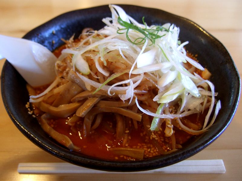 で、まずは、日光赤おろち。スープは、日光唐辛子を使ったという鮮烈な辛味と、自家製味噌の素朴ながら力強い風味、そしてそれを支えるスープの旨味などが一体となった、奥深い重厚な味わい。麺のアップ麺は、もんみやの記事によるとニラを練り込んであるとのことですが、こちらのバカうまラーメンなどに使われる麺と較べると、太くてもっちりした食感で食べ応えのある平打ちストレート麺。それにしても、濃い目のスープが良く絡みますね。 具は、スープに良く絡めて食べて欲しいという(確かに、そういうふうにいただくと美味でした)白ネギの笹切りや、スープと良く馴染んだモヤシなどの野菜類。それに、メンマと、たっぷりの挽肉が嬉しいです。ちなみにこちらのメニューは、東京ラーメンショー2010の際に販売されたとの事ですが、以前いただいた事のある、辛味噌ラーメン、花の季流が進化したものでよろしいのでしょうか?