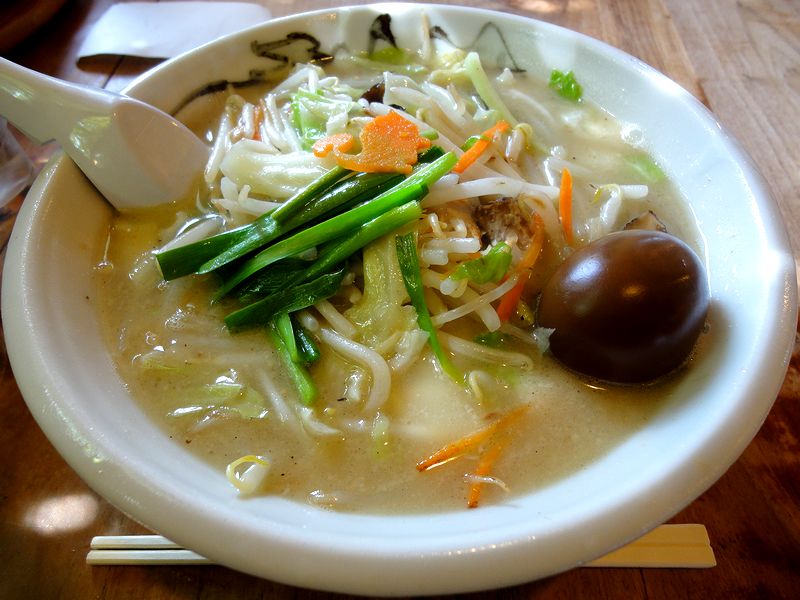 それで今回いただいたのは、こちらのメニューの中で個人的に一番好きかも知れないたんめん。シャキシャキの炒め野菜の旨味が加わった豚骨スープに、ツルツルの平打ち麺の組み合わせは、何度いただいても旨いんですよね。で、これまでの記事でも何度か書いていますが、こちらのたんめんは基本的に季節の野菜を使う為、まさしく一期一会の味というか。ちなみに、今回の野菜の中では茄子が珍しく感じたのですが、これがまた悪くないというか、こちらの豚骨スープに出会ってしまうと、あたかも元々のレシピに書いてあったかのようなマッチングなんですよね。それと追加の煮玉子も、相変わらずホクホクして良い塩梅で美味でした。