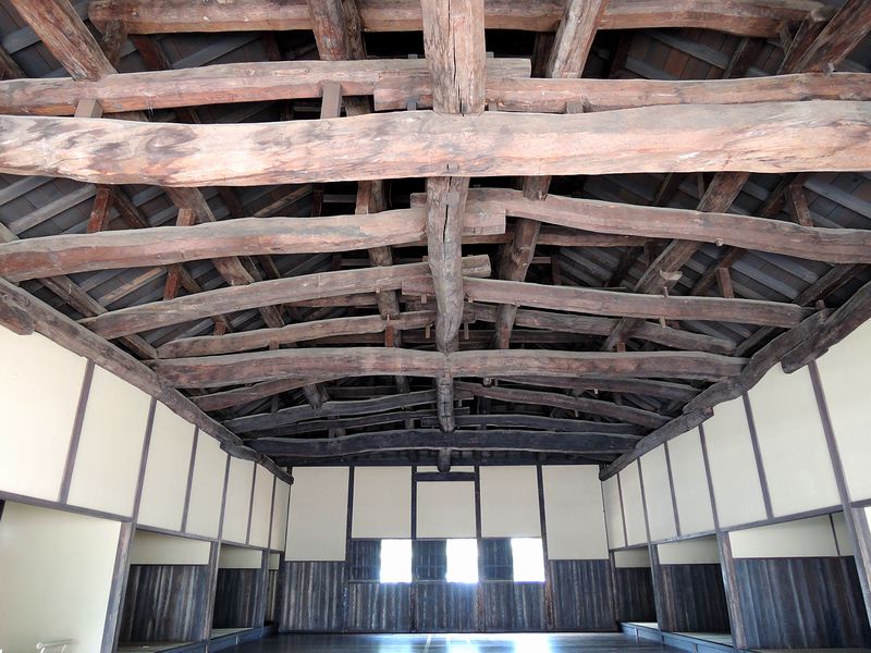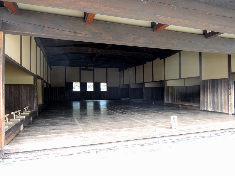 弓術所に相対するというか、文学所の並びが槍術所。こちらは、縁側?から内部が良く見えたのですが、目を惹いたのが屋根を支える梁。小屋造りと呼ばれるそうなのですが、なかなかテクニカルで見事というか。