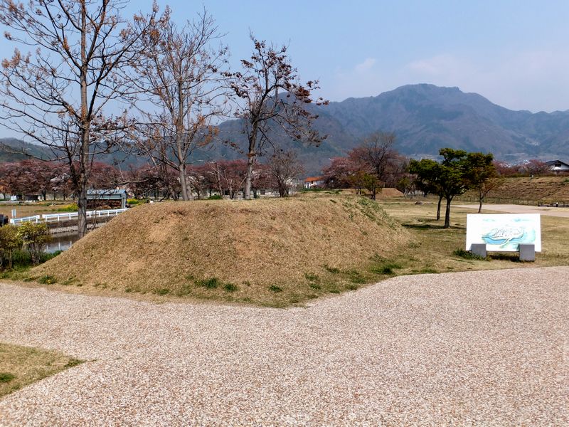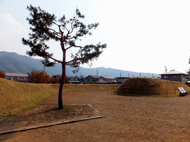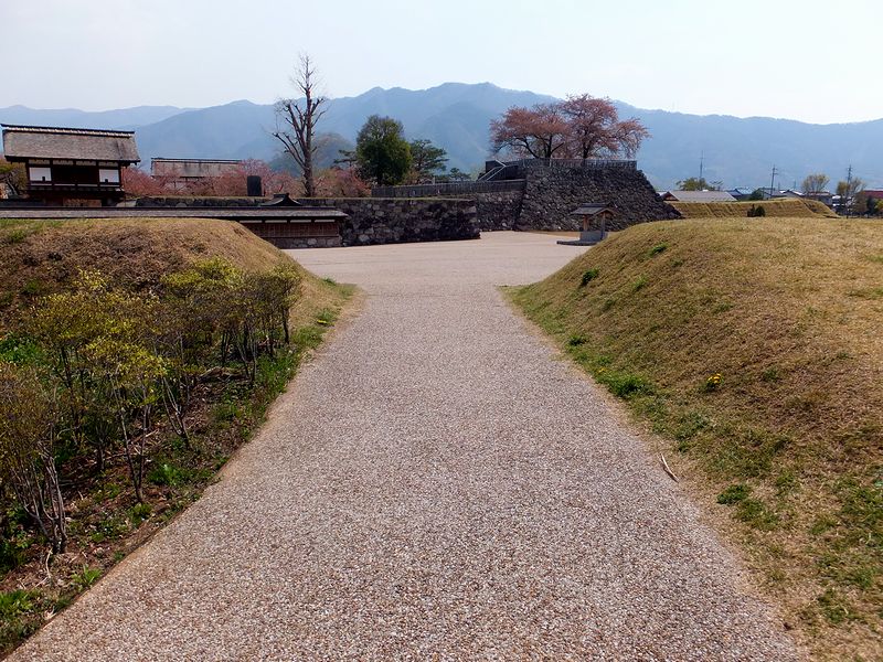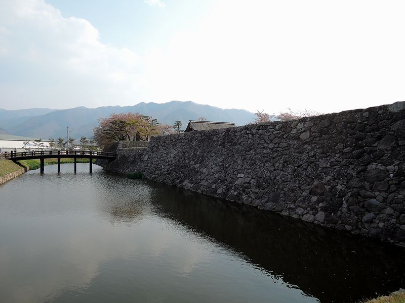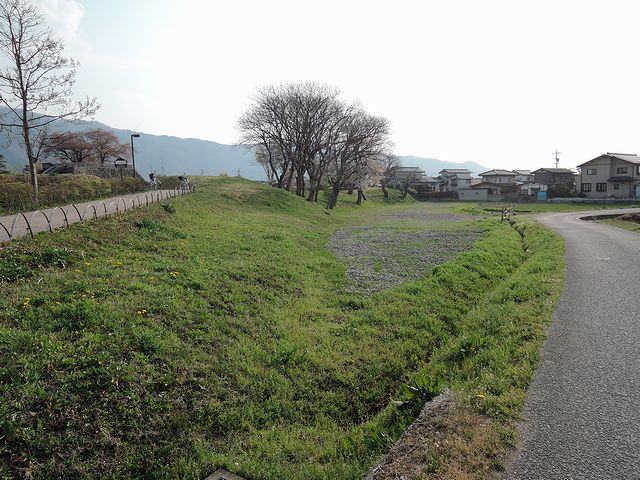 色々見て回る打ちにその見応えに思いの外疲れてしまったのですが、再び松代城へ。お城の北側から来た時は、田畑の中の城跡という印象だったのが、こちら側からだと街中の城跡という印象に変わりました。で、先程の北側入口のところにもあったのですが、幕末の松代城に基づいた再現図があるのですが、それに依れば、二の丸南門を出ると丸馬出、そして三日月堀があったのですね。また、この辺りには土塁が復元?されてしました。