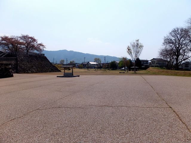 それで、今回は少々アテにならなかったカーナビ代わりのスマホアプリに導かれるうち、お城のちょっと北側にある駐車場のあたりに何となく到着。他の駐車場を探すのも面倒だったので、ここからお城へと向かうことにしました。そんな訳で、案内看板に沿って歩いてお城へと向かうのですが、北側から向かうと田畑の中に城跡があるような印象です。