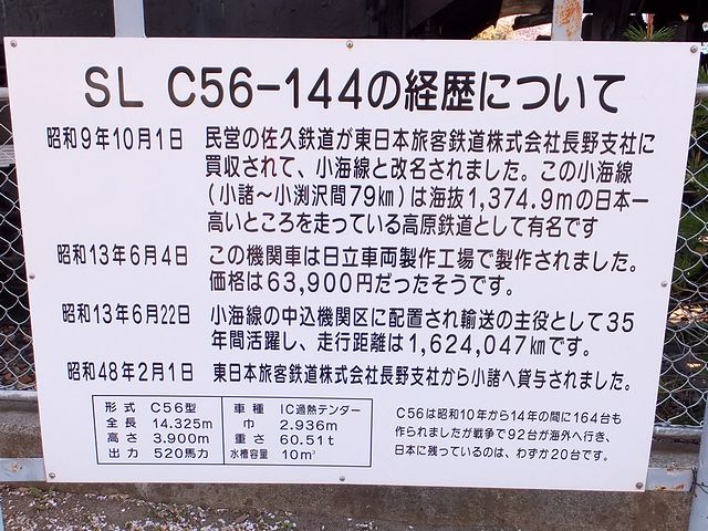 で、保存されているC56形蒸気機関車は、ここ小諸と山梨県の小淵沢とを結んでいる小海線で活躍していた機関車なのですが、その傍らに立つ説明書きが微妙に???。小海線の小諸-小海間は大正8年(1919年)に佐久鉄道によって開通したことは間違いないのですが、それを買収したのがJR東日本長野支社って、ちょっとスッ飛ばしすぎな気が。そりゃ、国鉄が分割民営化によってJRに移行したので、現在のJR東日本=当時の国鉄ってことで間違いは無いと思うのですが、「ご丁寧に「長野支社」って付けるくらいなら、当時の国鉄とか書いた方が…。」などとオタクっぽいこだわりを持ち出したくなってしまうというか。