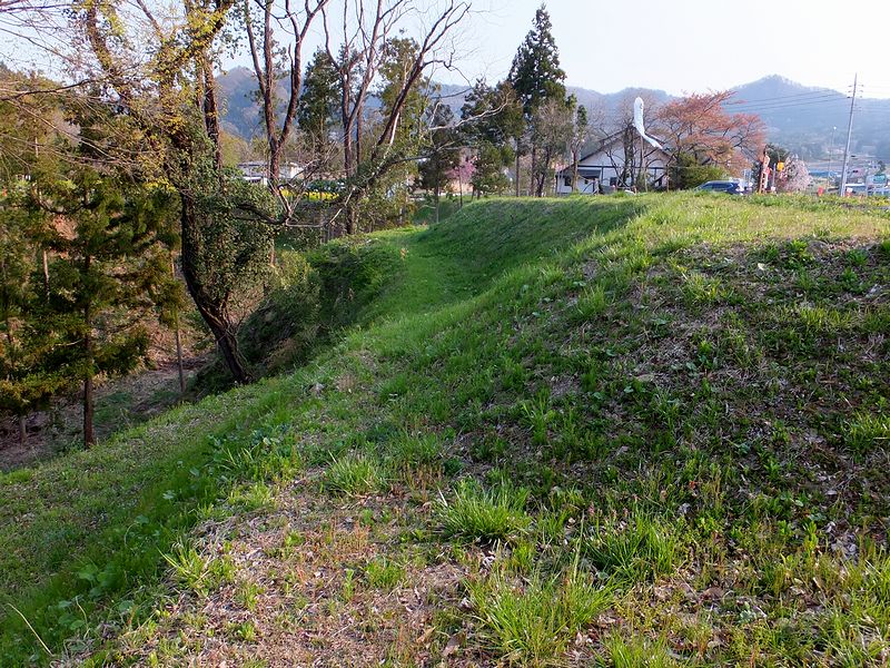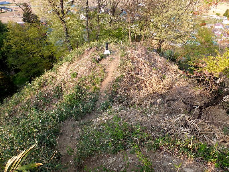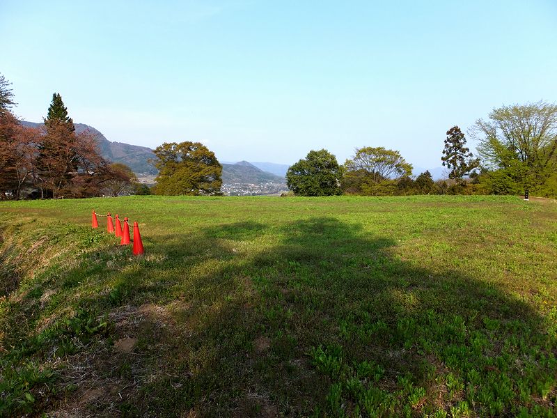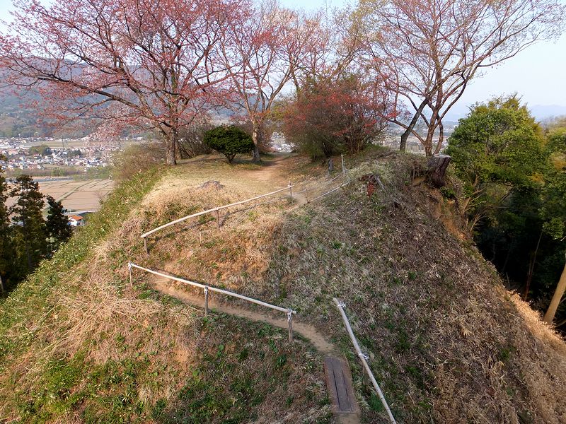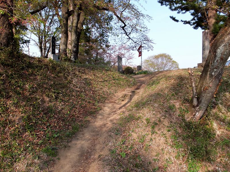 本丸の先には袖郭が。入口の案内板ではささ郭となっていましたが、笹の葉みたいに細長い形状だからなんですかね?それで、ここには低い土塁も残っていました。そしてその先には物見郭が有ったのですが、ここ二日間の旅の疲れが足腰に来ていたためその間の土橋を渡る自信が無く断念。もし事故でも起こしたら、現在わりと自由に見られるこの城跡が、そうでなくなってしまうかもしれないので。