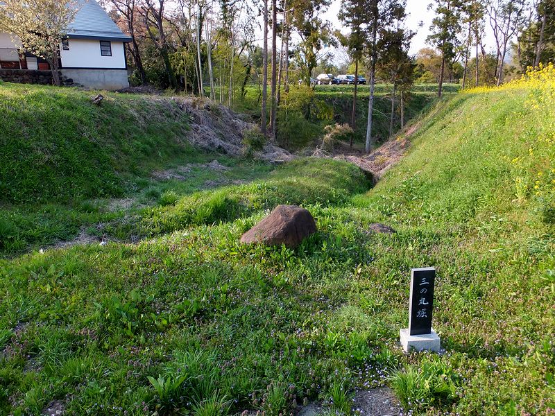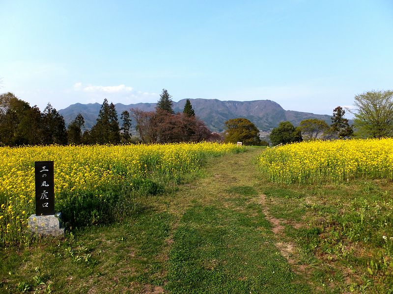 だいぶ浅くなってしまったかもしれませんが、郭と郭の間の堀はしっかりと残っていて、その間は土橋で結ばれています。で、その先の三の丸は菜の花畑になっているのですが、菜の花って、結構刺激の強い匂いがしません?