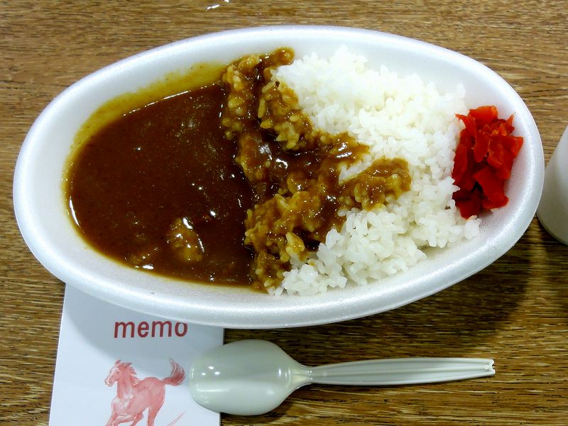 こちらのお店のメニューは、全ての品に「大盛」って付いていますが、確かにわりとボリューミーかもしれません。ちなみに、午後遅い時間になると、これが更に大盛になるそうで。で、同行者がいただいた物を味見させて貰ったのですが、ビーフのせいかサラっとした感じの旨味の、手作り感のある、ちょっと懐かしいホッとする味というか。それにしても、競馬場のカレーって、一度に大量に仕込むからか、外れが少ないように思います。ごちそうさまでした。