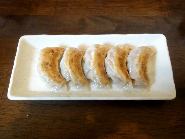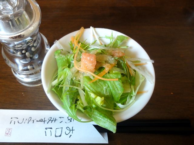 こちらは、一緒にいただいた物その1。(同行者と半分こしていただきました。)それにしても、相変わらずこちらのセットはバーゲン過ぎるプライスですね。で、セットのサラダいただくのは久しぶりですが、キリっと冷えていて、酸味のきいたドレッシングが良いです。また餃子は、このお値段にしては大変立派というか、間違いがないというか。ちなみに、卓上に3種類置かれた餃子のタレ減り具合から見ると、味噌味が一番人気のようでしたが、個人的には、塩味が好きだったりして。(どれも美味しいですけどね。)また、杏仁豆腐からチェンジした小ライスは、ラーメン食べ終わった後のスープに投入し、スープの味を堪能し尽くしました。