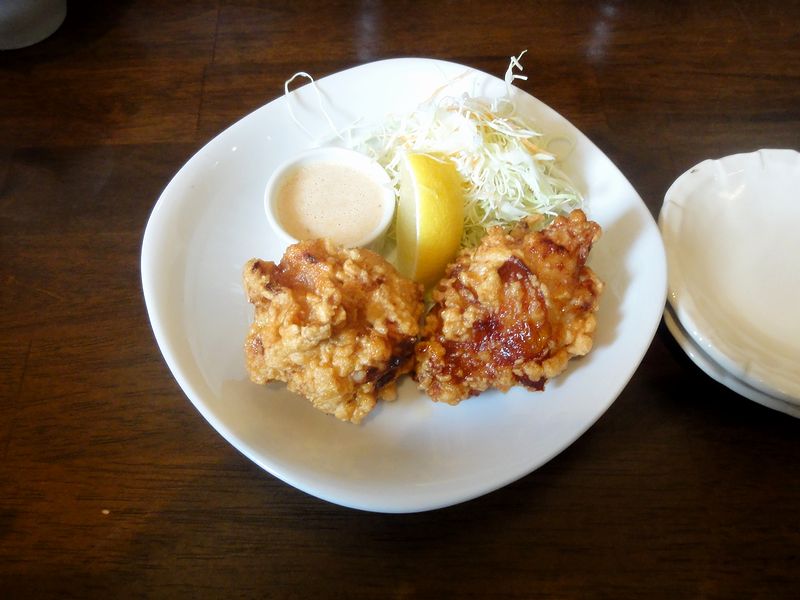 こちらは、一緒にいただいた物その2。(こちらも同行者と半分こしていただきました。)で、こちらの唐揚げをいただくのは久しぶりなのですが、以前いただいた時同様、唐揚げ自体の味も美味しいのですが、付属のタレをかけると、さらに美味しいですね。ちなみにタレは、付け合わせのキャベツにかけてもすごく合います。