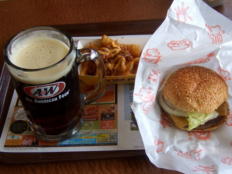 そこでいただくのは、ハンバーガー(ビッガーチーズバーガー)とポテトフライ(チリチーズカーリーフライ)、そしてルートビアのセット。ハンバーガーはスタンダードながらも大手チェーンとはちょっと違った感じがして美味しく、チリソースとチーズが掛かったポテトフライもなかなかだったのですが、なんと言っても初めて飲むルートビア!一部では『飲むサロンパス』とも形容される独特な味(ちなみに「ルートビア 不味い」で検索するとネガティブな感想が出るわ出るわ…。)があるそうなのですがですが、個人的には、言われているほど不味くは。ドクターペッパーにメントールを入れ、更に薬臭くしたような感じの味って、文字にするといかにも不味そうな感じがしますが、何ともクセになる味で、ハンバーガーとの相性もグッドですね。それで調子に乗って、自分で注げるルートビアのサーバーでお代わり(ちなみに店内でいただく時は、ルートビアはお代わり自由なんです。)してしまいましたが、泡ばかりになってしまったのも楽しい思い出になりました。