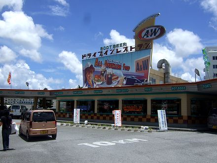前の記事のとおり、今回沖縄に来たら是非ともいただいてもたかったのが沖縄そばだったのですが、それと並んでもう一つ、是非ともいただいてみたかったというか、お伺いしてみたかったお店ありまして。で、それは、那覇市の北隣、浦添市にあるこちらのA&W牧港店。以前、あるサイトでこのお店の写真を見て、ドライブインスペース(車に乗ったまま注文・飲食が出来る)がある、ちょっと古めの、いかにもアメリカンな店構えに、是非一度訪れてみたいと思っていました。