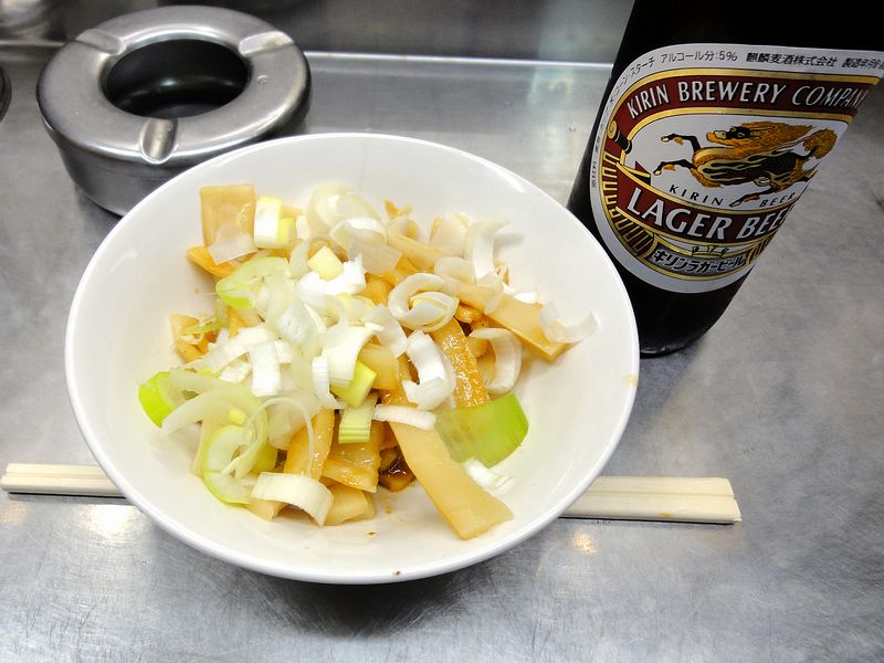 というわけで、郷に入りては郷に従えという言葉もありますので、私も小瓶のビールと竹の子を注文。サッと出てきた竹の子はいわゆるメンマなんですが、煮上がったメンマにラーメンのタレと魔法の調味料、そして刻んだネギを載せた物で、これがビールと良く合いますね。(ビールは中瓶にしとけば良かったかなぁ。)