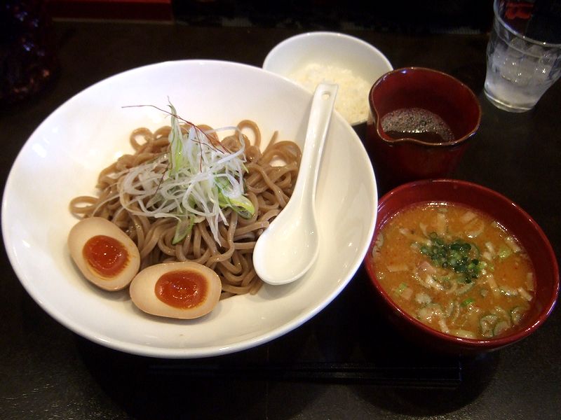 まずは1本だけ何も付けずに啜った茶色がかった太い麺は、今時の硬質な歯応えにツルツルっとした喉越しも兼備。して、その麺をつけ汁に浸けていただけば、最初の美味が。つけ汁は、豚骨・鶏ガラを乳化しすぎないように炊きつめた物がベースだそうですが、狙いどおり素材のクセは感じられず、更にまぁるい味の味噌だれが加わって、濃厚なのにとってもスムース。そこに、つけ汁に浮かぶ粗く刻まれた白ネギと小口切りの青ネギ、そして麺の上にあしらわれたさらしネギという3種の葱が絶妙のアクセントとなって、それらが麺と一緒に口に入ると、もう。そして、別の容器で提供される魚介だしを少量ずつつけ汁に加えてみると、第二の美味が。加える前に、少しだけ魚介だしを単体で味わってみたところ、香ばしい風味にしっかりと煮出された旨味を感じますが、こちらも素材のクセは皆無。これだけでも十分に美味しいのですが、それをつけ汁に加えると、その香ばしい風味と旨味が元々の動物系つけ汁とマリアージュし、更には加える量によって表情が変化。しかも、結構たっぷりめに提供される魚介だしを全部加えてしまっても、つけ汁がほとんど薄まった感じがしないというのも凄いです。で、それを、丁度良い塩梅の煮玉子や、つけ汁の中に入っている柔らかくジューシーなチャーシューと共にいただき、最後は(平日ランチタイムにサービスとなる)小めしをつけ汁に投入して味わい尽くせば、何も言うことはございません。これまで個人的にいただいた事のあるつけ麺の中では、間違いなくトップクラスの味だと思いました。