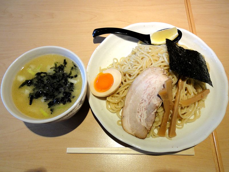 で、いただいたのは、実は前回お伺いした時に気になっていたこちら。つけ汁は、こちらのお店のメインである鶏白湯ベース。前回いただいた旨塩らぁめんでは魚風味が感じられましたが、こちらはストレートに『鶏っ!』という感じで、あちらより、よりストロングな感じが。また麺は、太めのストレート麺で、プリっモチっとした食感。そして具は、柔らかいチャーシューに風味が良いメンマ、半熟の味玉など。その中でもつけ汁に入れられた岩のり割りスープが、鶏白湯と絶妙なマッチングで、何とも良いアクセントになっていますね。それと、添えられたレモンは途中から麺に搾っていただきましたが、これまた鶏白湯と合っていて、最後まで飽きずにいただけます。あと、最後にスープ割りをお願いすると、割りスープが熱々の状態で出てきました。おかげで冷め気味のつけ汁が再び香り立つというか。ちなみに割りスープは、あっさりした魚系の出し汁でした。