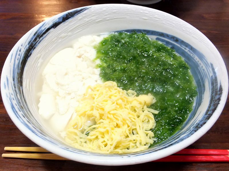 それでいただいたのが、ベーシックなそばと迷ってこちらにした限定10食というアーサそば。まず見た目ですが、アーサ(アオサ)の黄緑色の他、ゆし豆腐の白、そして錦糸卵の黄色がとても綺麗ですね。で、とりあえずつゆを一口啜ると、まずはアーサの良い香りが。そしてそのお味ですが、ベースは豚骨だと思うのですが、そこに野菜のような自然な甘味が加わって、優しくまろやかです。それと、今回のお目当てでもある自家製生麺は、ツルツルっとした啜り心地が平打ちのラーメンを思わせるのですが、味は沖縄そばというか、小麦の風味が生きている感じがして、なんていうか、初体験の美味しさ。また、具のゆし豆腐のフルフル感と大豆の風味も良く合っていて、そこに更に、前述のアーサの風味がアクセントになって、何とも重層的な味わいですね。あと、ランチタイムのサービスということで、ついお願いしたご飯ですが、卓上の紅ショウガをおかずにいただきました。