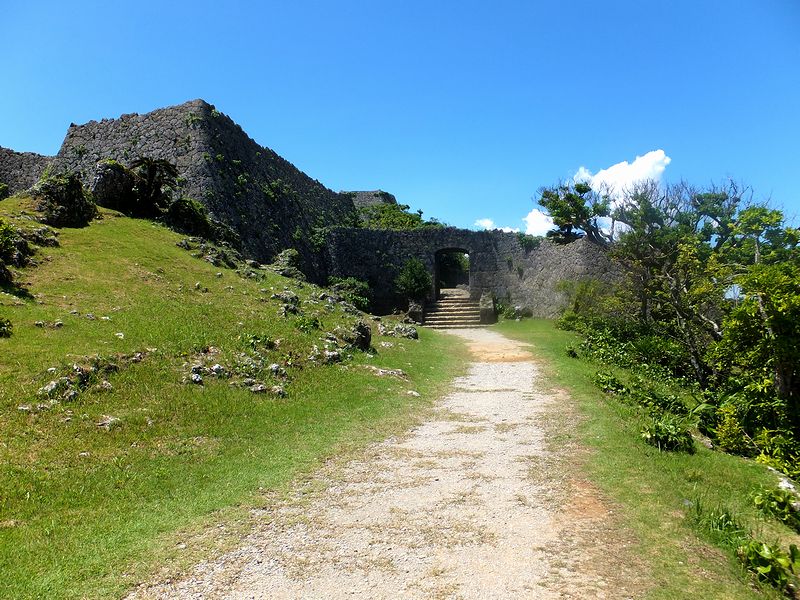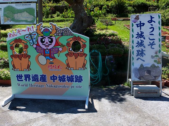 駐車場から坂をちょっと登って料金所へと向かえば、ご当地ゆるキャラ『護佐丸』の顔出し看板や案内図があるのですが、その案内図を見ると、このグスクが山の稜線に沿って築かれていたことが何となくわかるような。で、それらの向かいにある料金所で、日本100名城スタンプラリーのスタンプをいただき、入場料を払って、いざ。