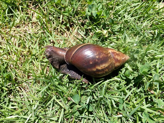 料金所からの坂道を登ると、目に飛び込んでくるのがこの光景。青い空と緑の芝生の間に城壁の石垣という、なかなかに素晴しい光景ですね。でも、城壁に近づこうと芝生を歩いていると、そこに見慣れない物体が。よく見ると、これ、要注意外来生物指定(沖縄県では駆除対象)でヤバイ寄生虫である広東住血線虫の宿主(もっとも、素手で触らない限り大丈夫ですが。)のアフリカマイマイでは。いやぁ、噂には聞いていましたが、実物は結構グロイですね。