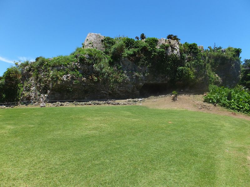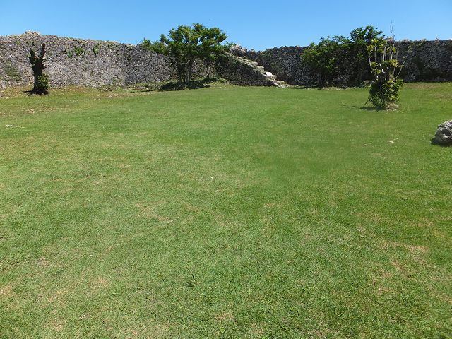 それでまずは聳え立つ三の郭の城壁を堪能。ちなみに三の郭はこのグスクで最後の方に増築されたので新城(みーぐすく)とも呼ばれるそうで、その城壁の石積はこのグスクで最も進んだ積み方である相方(あいかた)積み(亀甲乱積み)によってなされています。それにしても、石積が真っ直ぐではなく正面が凹んだようになっているのは、どのような意味があるのでしょうか。また、内部は城壁の立派さに較べると意外とコンパクトな印象でした。