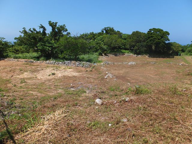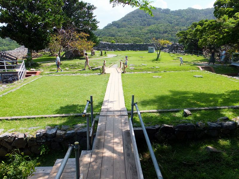 外郭に当たる部分にも低い石垣や拝所が復元されていたり、掘立柱建物跡がわかるよう整備されています。それにしても、石積が特徴的な波形のカーブを描いていますね。