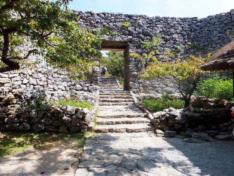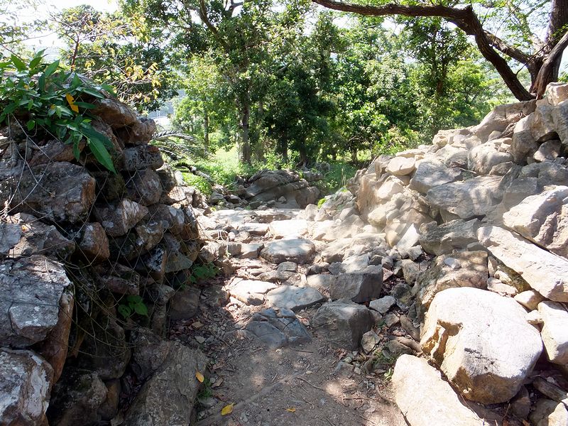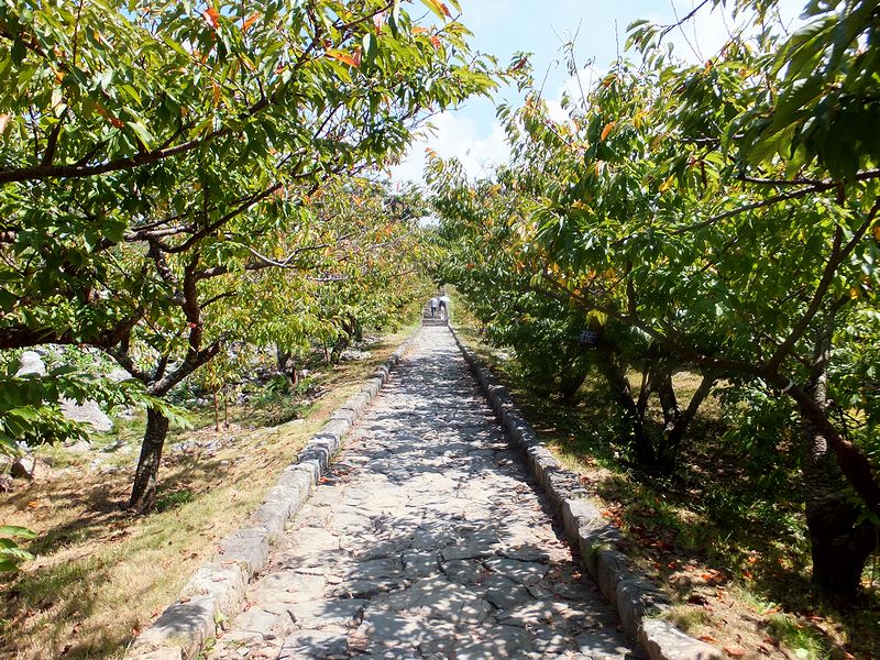 平朗門(へいろうもん)から右手に向かって伸びるのが、元々の道というか通路である旧道。入口のところから奥というか上に向かうと道は一気に狭く急峻になるのですが、攻められた時に守りやすくする為、そうした造りになっているそう。