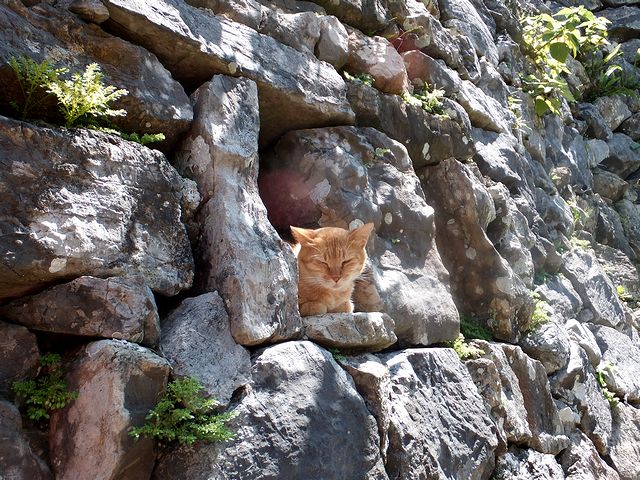 大隅(うーしみ)の向かって右手にあるのが、今帰仁城の正門と言うべき平朗門(へいろうもん)。昭和37年(1962年)に修復されたそうです。また、この門のすぐ脇ところには狭間があるのですが、そこには猫が良い感じに鎮座していました。