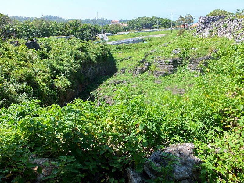 いきなり感のある写真になってしまいましたが、こちらは平朗門(へいろうもん)から右に外れたところにある窪地でカーザフと呼ばれる場所。(ちなみに、写真はグスク内から見下ろす感じで撮ってます。)川の谷間という意味らしいのですが、グスク内の水利も兼ねていたんですかね?