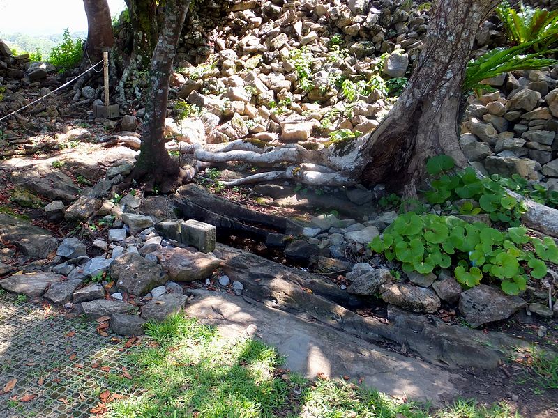 平朗門(へいろうもん)から七五三の階段もしくは旧道を登り切ったところにあるのが、大庭(うーみやー)と呼ばれる郭。ここには、名前のとおり広場的な場所の他、南殿・北殿といった建物があったそう。また、東南側には常時水を湛えている窪んだ岩石があり、カラウカーと呼ばれているのですが、そこはかつて女官達が髪を洗ったり、水量で吉凶を占ったと伝えられているとのこと。