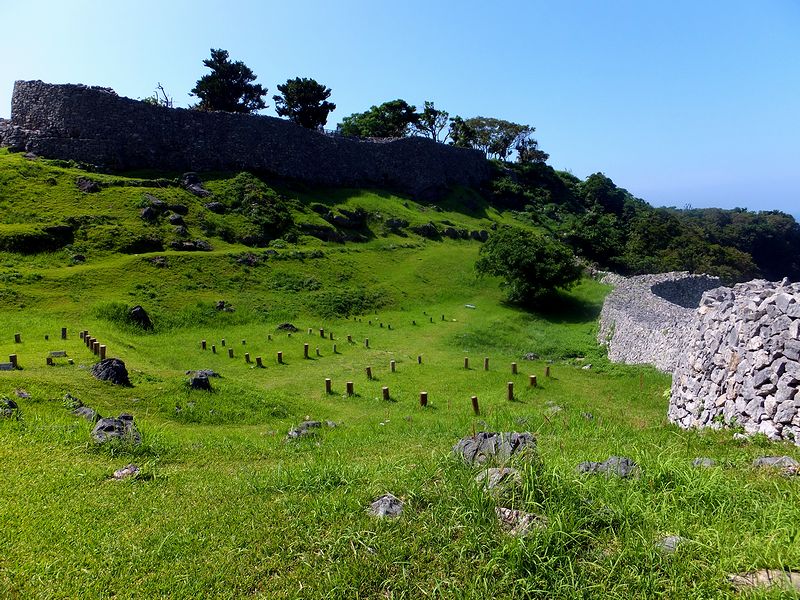 主郭の更に奥というか外側にある郭が、この志慶真門郭(しじまじょうかく)。地面から生えている短い丸太は、郭に有った掘立柱建物跡をあらわしています。で、この更に奥というか山手方向の石積の外には、志慶真ムラが有ったそうで。