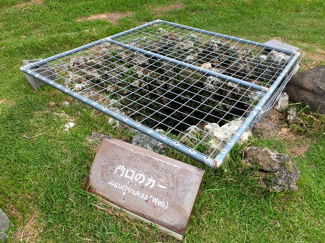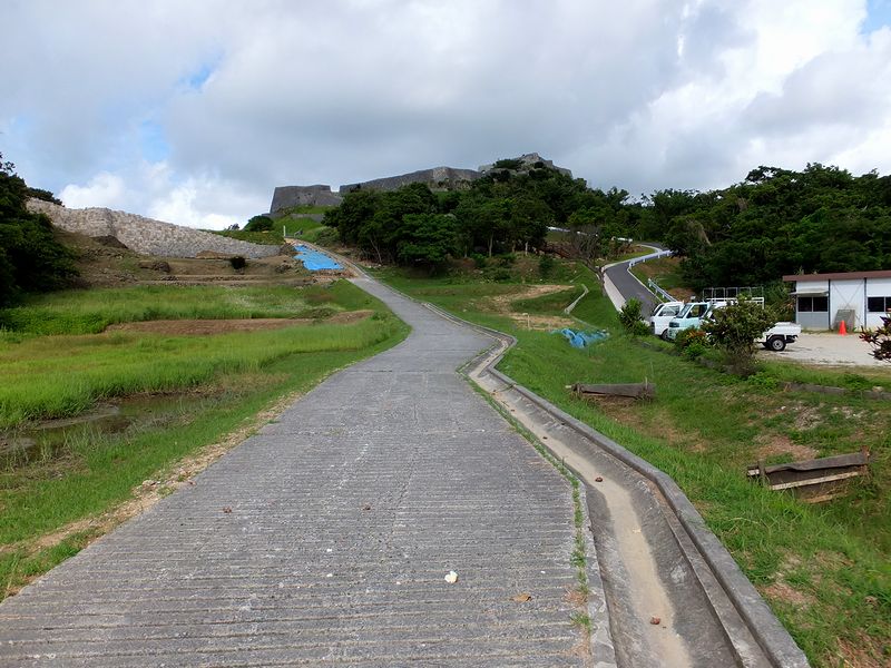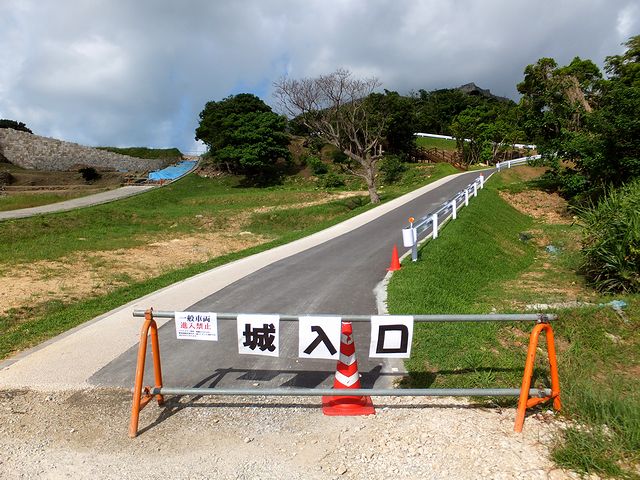 それで道路を渡っていざ、グスクへ、なのですが、城内は現在、整備工事が続いていて、昔整備されたとおぼしき通路は途中で途切れ、そのあたりには石積が整備中。で、現在はその脇に作られた道路が入口になっているようです。