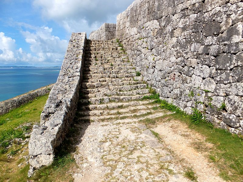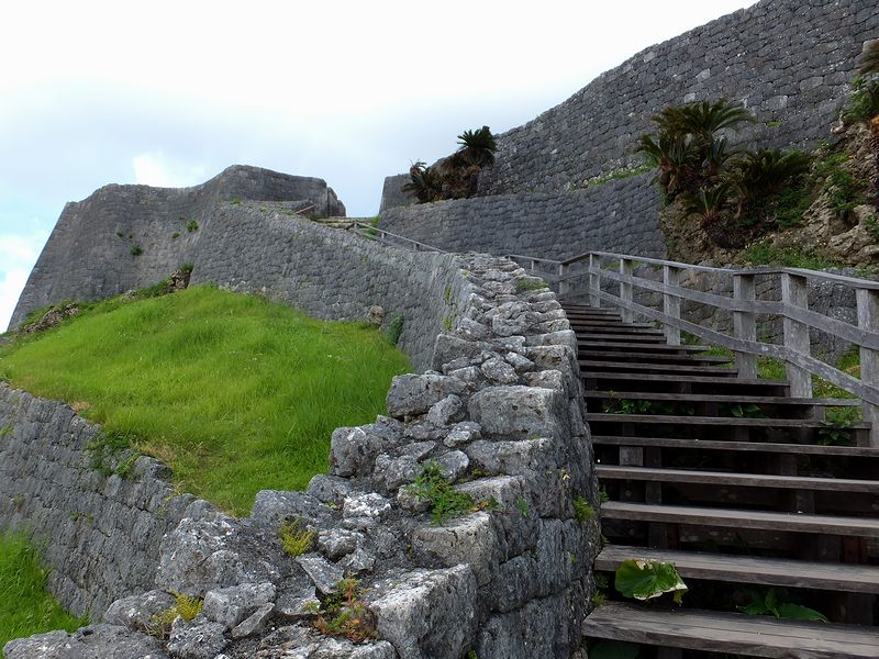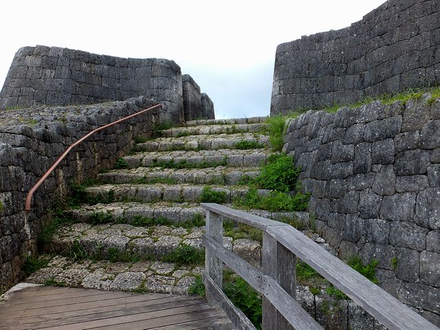 それにしてもこの勝連城。布積みされた石積が綺麗ですね。三の郭の間は、元々、石畳の通路というか階段があったのですが、現在はその上(の大部分)に木製の階段が作られ、だいぶ登りやすくなっています。