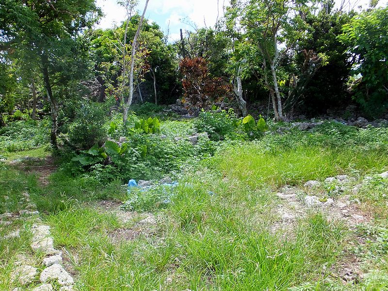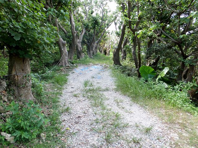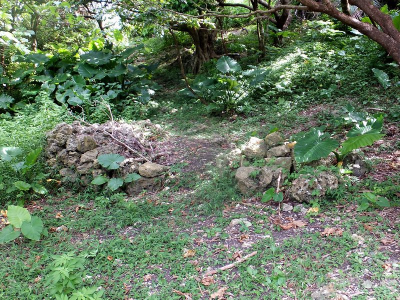 駐車場からは、林の中の小径をちょっとだけ通ってメインの城跡へ。で、この辺りもグスク跡だったのか、林の中には石積の基部?が残されていました。
