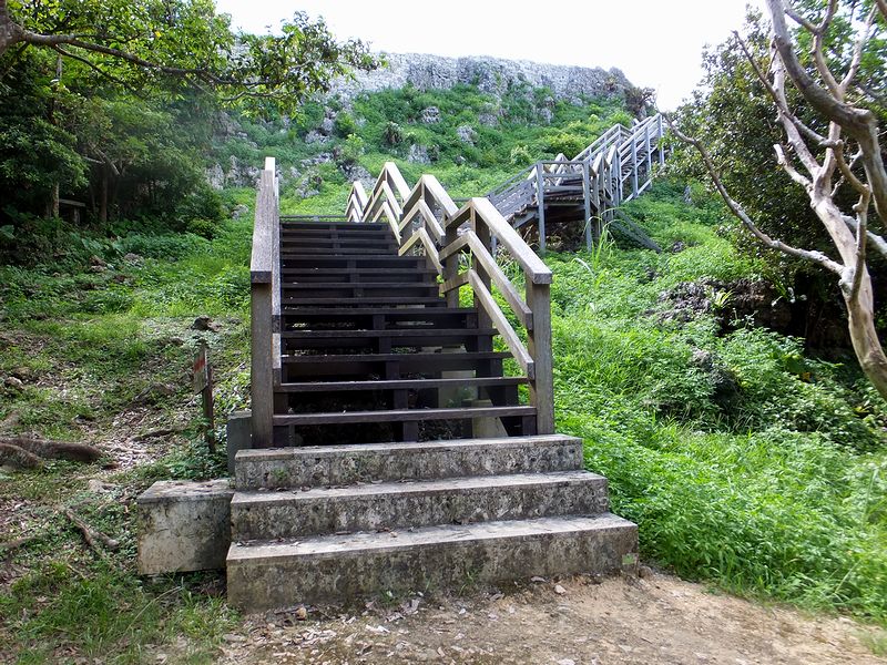 小径を抜けると、主郭へと続く木製の階段が目に入ります。これを登れば主郭のある石灰岩で出来た小山の上部まで行けるのですが、近くで見ると、階段の存在がとても有り難くなるような小山の感じです。