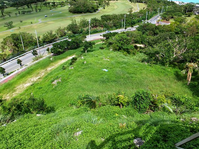 その階段を上りきったところから見下ろした景色は、ちょっとしたもの。また、このグスクのある小山の方を上から見ると、斜面には石積基部?があったり、郭跡と思われる平になっている部分があったりしました。