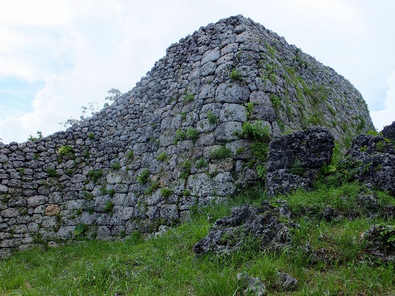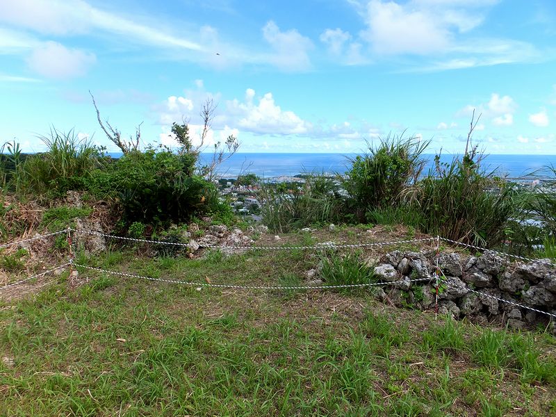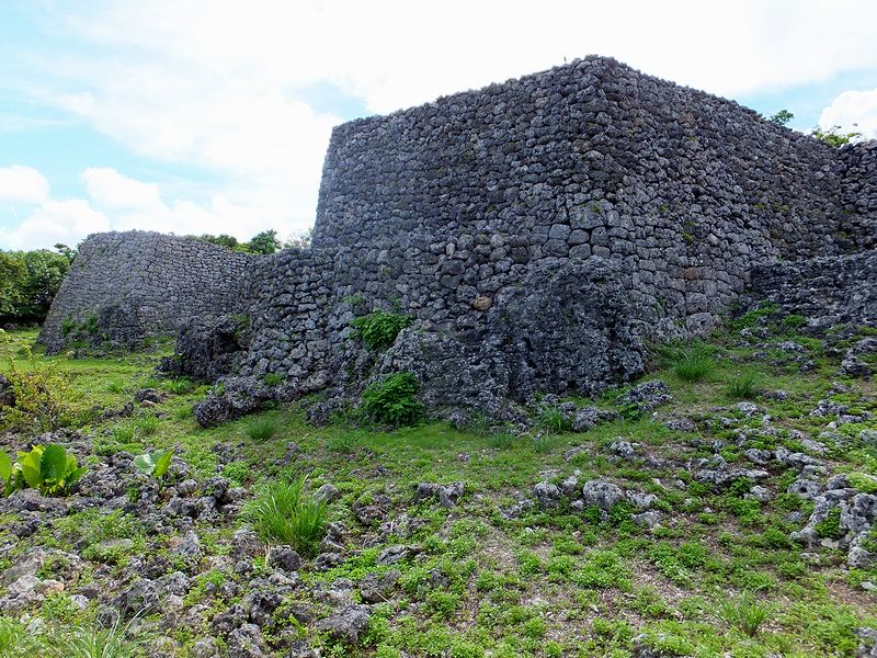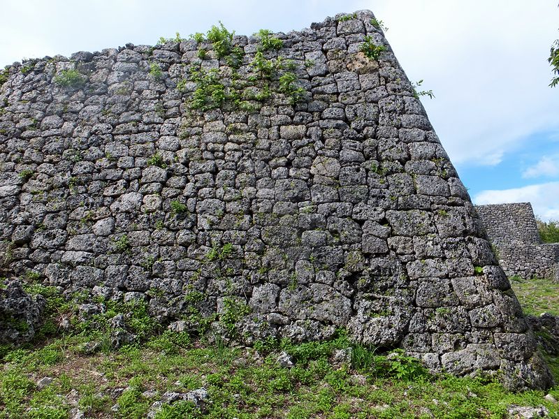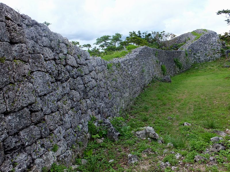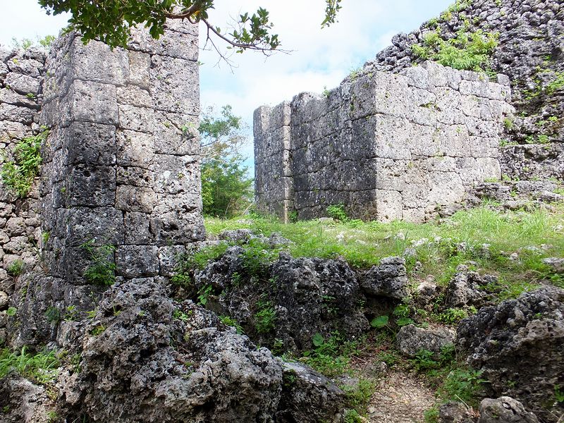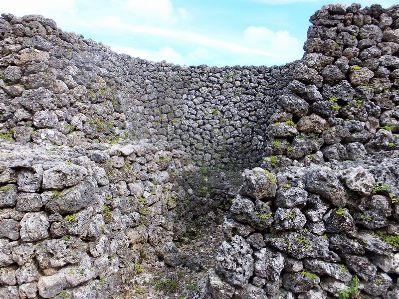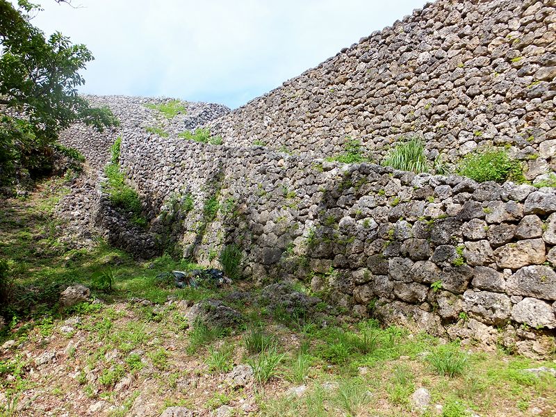 広場から北東の方向に、なにやら高い石積が見えたのですが、後で調べたところによると「北のアザナ」と言って、この糸数城跡で残る一番高い石積だったそうで。で、石積に使われている石が、下部は四角く整形してあるのに対し上部は野面積みっぽい感じがするのが不思議というか。あとアザナというのは、いまいちハッキリとわからなかったのですが、見張り台等の張り出した部分ということで良いのでしょうかね?