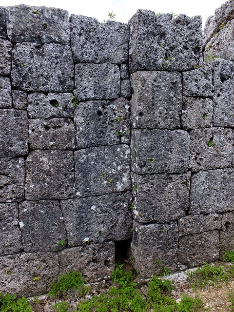 城壁の石積は、途中で段になっているところが有るのは城壁の内側から撮った写真ということになるんですかね。また、石積に用いられている石が、布積の四角く加工された石だったり、野面積の自然石っぽいのもあったりと、場所によってバラエティー豊かなのですが、何故そういうふうになったんですかね?あと、石積内側の部分には、なにやら意味有りげな形状の箇所がありましたが、これまたどういう役割をしていたんですかね?