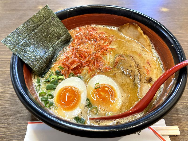 それがこの、期間限定メニューの海老味噌ラーメン。POPに写真が載っていたので登場時に見た目で驚くことはなかったのですが、丼から漂ってくる香ばしい海老の香りは予想以上でした。