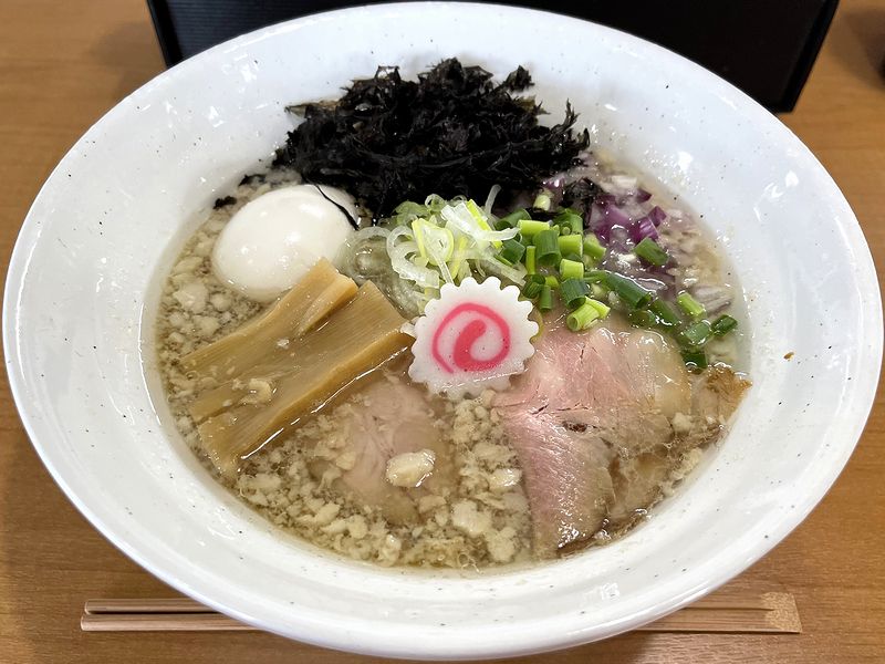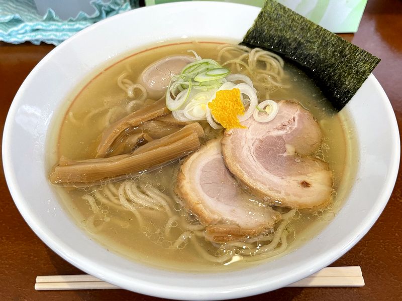 あとは、券売機で食券を購入してカウンター席に着席。店主さんたちのキビキビした調理を眺めつつ待つこと少しで、食べたかった塩ラーメンとご対面です。