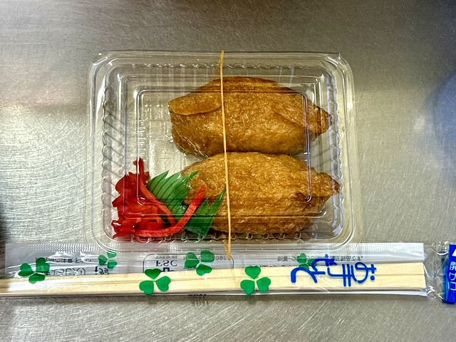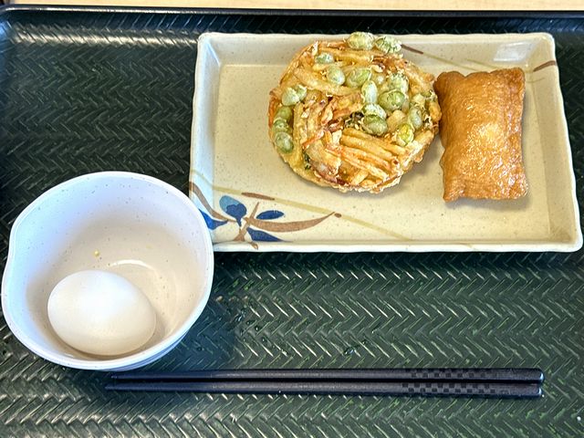 【半熟たまご 110円 と 季節のかき揚げ(枝豆かき揚げ) 200円 と ごまいなり 140円】