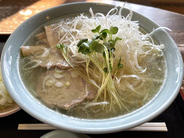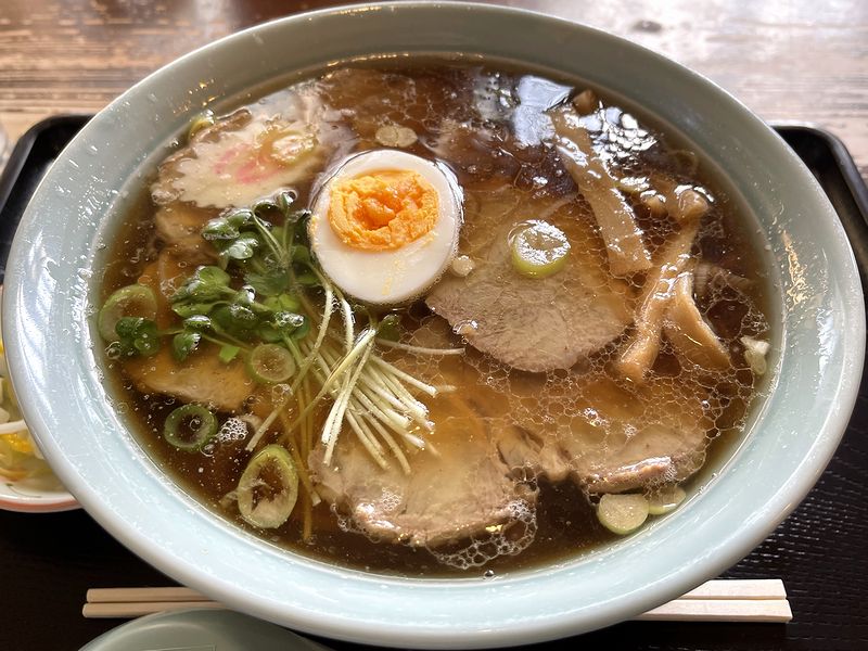 またチャーシューは、ホロっとしつつも繊維を感じる柔らかめのものがたっぷり。チャーシュー自体の味付けも、素朴な感じが悪くなく。あと、メンマは味付けあっさり目で、カイワレは薬味っぽくマッチ。あとゆで卵が懐かしくもあり、嬉しくもありという感じで。