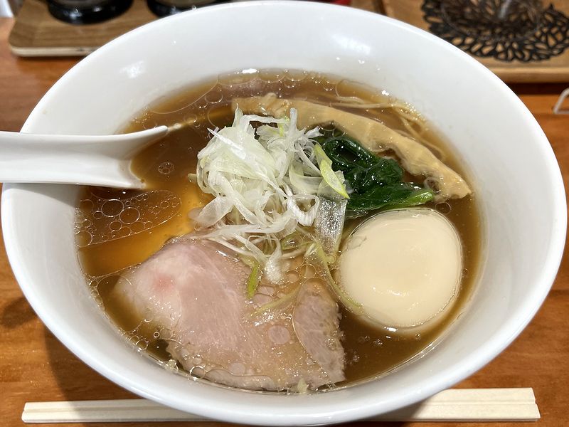 それで今回のメインは、こちらのお店の基本メニューと思われる貝出汁中華そばの醤油味に味玉を追加して。今時のラーメン専門店らしい、下部が窄まった器に盛られたそれは、なんとも端正な佇まい。ですが、それよりも印象的なのは、この状態でも器から、貝出汁の美味そうな香りが。