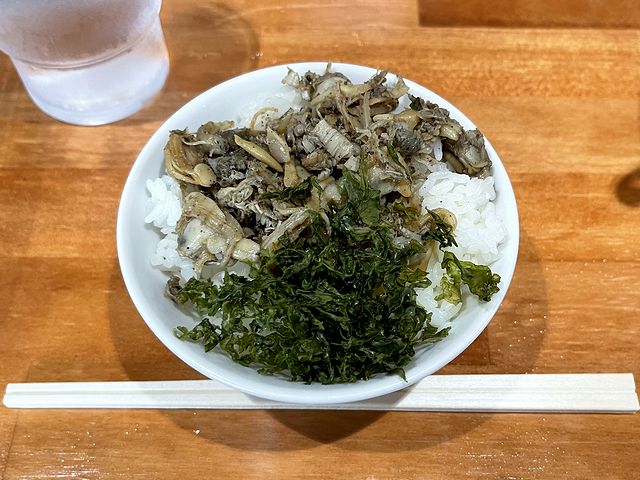 こちらは、平日限定につられて一緒にいただいた品。小振りな丼に盛られた御飯の上には、アサリの身とアオサでしょうか?が載っています。