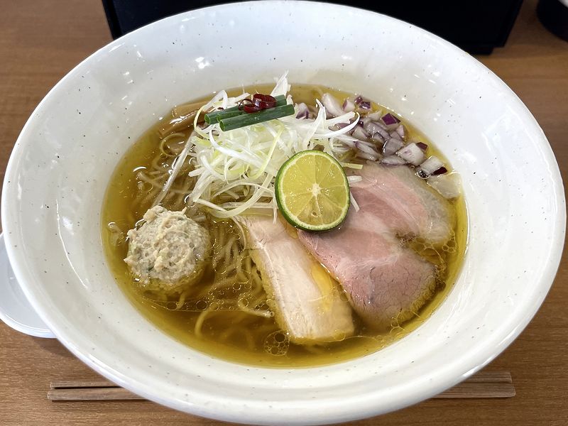 気を取り直して、まずはスープからいただいてこると、やっぱりこの金色のスープは美味いです。以前も書きましたが、黄金色の澄んだスープからは鶏の良いところだけ抽出したかのような風味と旨味が。特に風味は濃すぎたら品が無くなるところを、絶妙な匙加減で、満足できるけど上品な濃さにしているような。それは味付けにしてもそうで、むやみに濃くせず、青ネギ、白ネギ、紫タマネギ、更には味変用のスダチといった薬味類も上手く使って、全体的な味を構成しているような。
