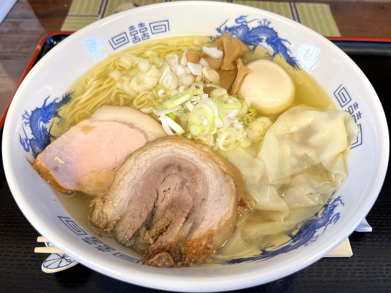 何故ならこちらのお店には、個人的塩ラーメンの好きランキングにおいて五指に入るしおらーめんがあるから。今回は手打ち麺への変更はせず、肉わんたんと味玉入りでお願いしました。