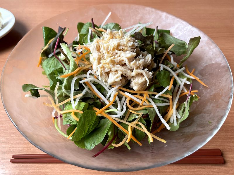 それがこの、ごま油香る彩り野菜と蒸し鶏のさっぱり冷やし中華(って、品名長っ!)。見た目的には、器の一面をベビーリーフと千切りの大根・人参が覆い、更にその上にほぐした蒸し鶏が載っていて、「サラダじゃん」となったのですが、その下には、当たり前ですがちゃんと麺、そしてタレが隠れておりました。