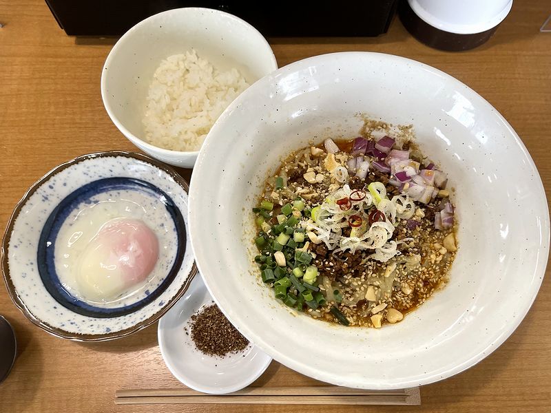 その気になる限定メニューというのが、この無し坦々麺。こちらのお店の汁有りな冷やし担々麺は、以前、限定メニューとして出されていたのをいただいた時、結構感激した覚えがあるのですが、汁無しタイプは初めて。店主さんのインスタによると、辛みと花山椒は苦手な方がいるのでオプションにされたようなので、とりあえず花山椒が入ると思われるシビレ追加で、温と冷が選べたので温のほうを、無料の小ライス付きでお願いしました。