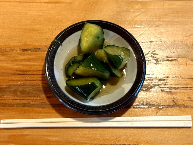 メインはたんめんと決まっていますが、まずはお通し(この日はきゅうりの浅漬)、そして最近ひそかに楽しみにしている野菜メニューから、なすの揚げ浸しを。