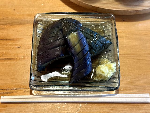 そしてなすの揚げ浸しは、揚げられて甘くトロっと仕上がったナスに、油のコク、タレの丁度良い味わいが加わって、これが、もう。生姜のフレッシュな刺激も最高の相性です。