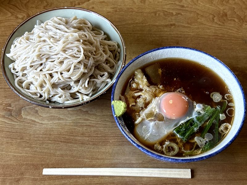 で、登場したらツユの容器に添えられたワサビをソバの上に移動させ、それを適期塗りたくったソバを、あらかじめかき揚げと玉子が入ったツユに付けズバババっと啜り込めば、これが、もう。色白若干太め若干短めのソバに、濃口醤油の効いた甘さ控えめのツユが絡むと、上品さとは対極的ながら、これぞ栃木県北の味わいというか。