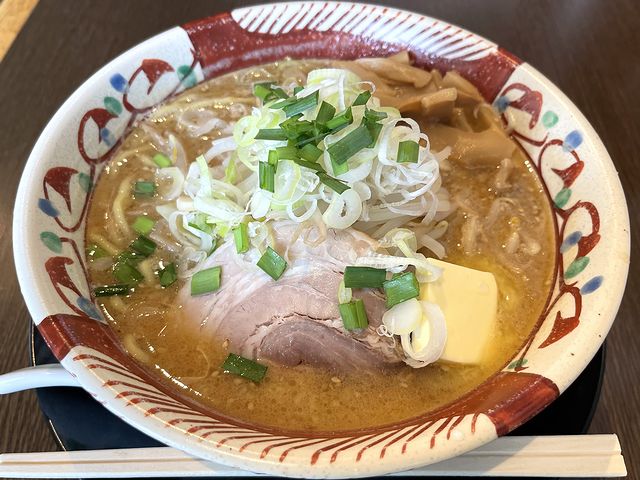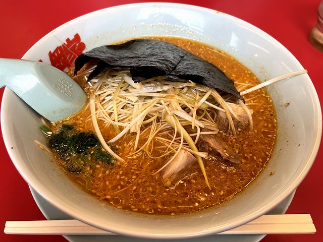 で、写真を撮らせて貰ったときに気が付いたのですが、特味噌なのに、スープが赤いというか、表面に結構な密度で唐辛子が浮いているのが見て取れました。